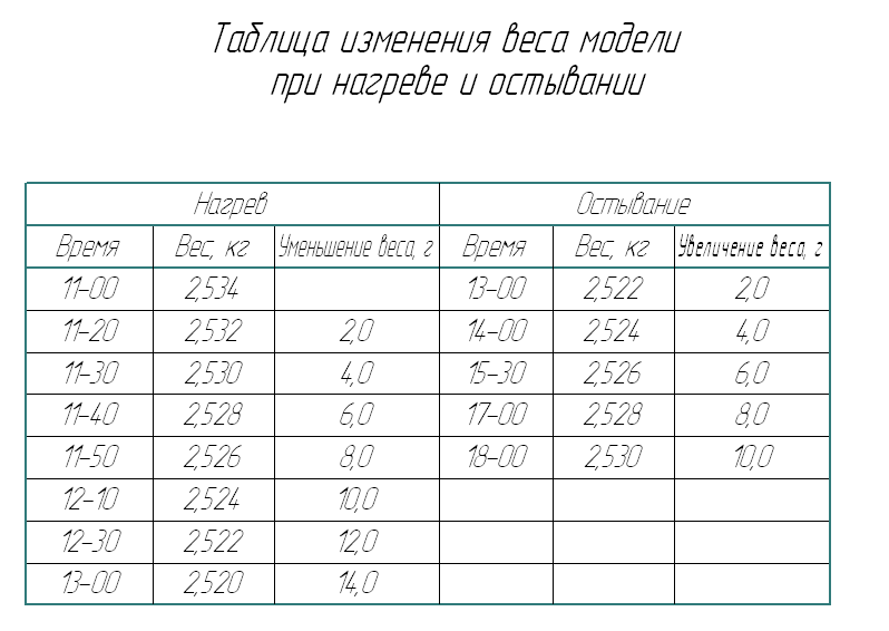 Анализ их показывает, что буквально через 20 минут после включения электропитания вес модели уменьшился на 2г. Далее уменьшение веса составляло по 2г каждые 10 минут. К концу эксперимента уменьшение веса замедлилось и последнее показание весов – 14г – произошло через полчаса после предыдущего. Затем, в течение часа вес не менялся. Почти сразу после отключения питания произошла прибавка веса на 2г. В процессе остывания интервалы времени между показаниями весов составляли часы. Если нагрев модели до конечного результата – 14г занял 2 часа, то остывание длилось 5 часов. При этом к исходному весу модель так и не вернулась. Разница составила 4г. Это, по-видимому, связано с жёсткостью электропровода, питающего спираль.